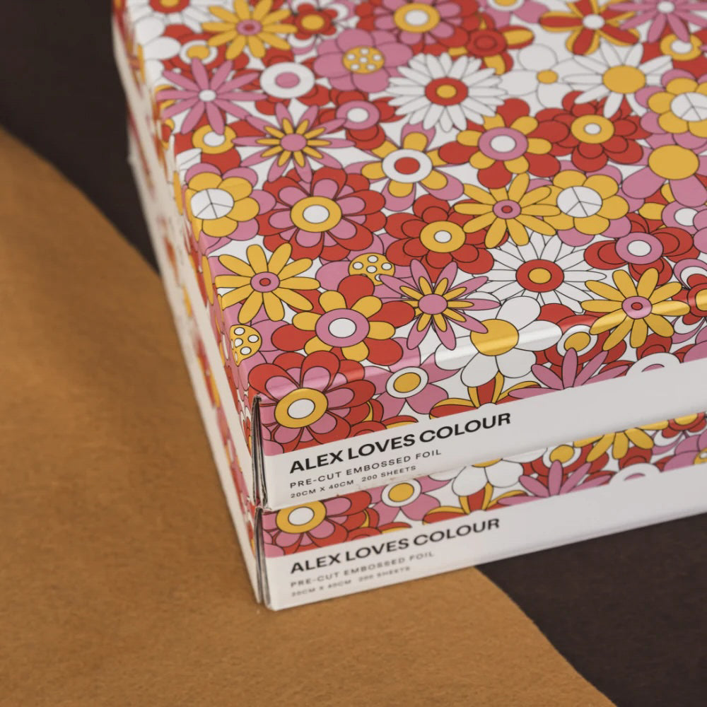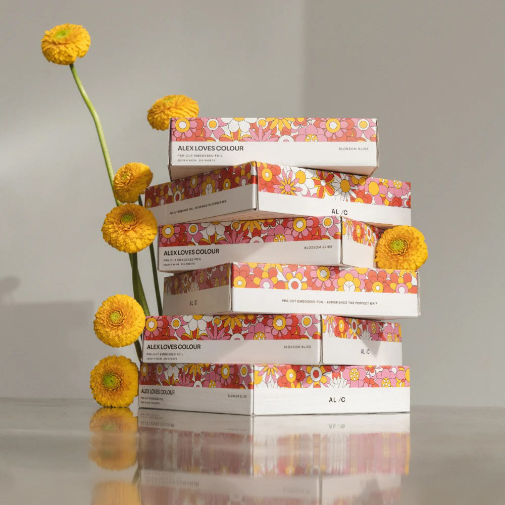 Each box of Alex Loves Colour Blossom Bliss Extra Wide contains 200 pre-cut sheets measuring 20cm x 40cm. These are perfectly sized for everyday foiling. Plus, the innovative "tissue box dispensing system" includes pop-up tabs at the bottom, which allows effortless access to the last few sheets. As the foils are pre-measured, the busiest hairdressers can save time and energy during their services.