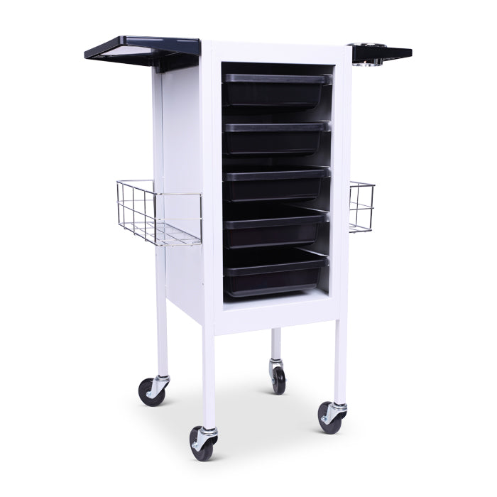 Do not tolerate clutter and mess any longer. Beauty Supply Co. Deluxe Metal Trolley White is perfect for all types of salon storage. There are five plastic drawers, two chrome-plated baskets and two folding trays attached to the tabletop. These will help you hold all of your favourite essentials.