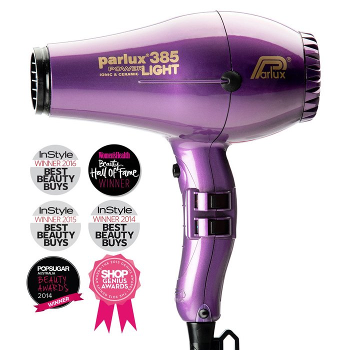 Parlux 385 Powerlight Dryer 2150W Violet featuring an incredible K-Lamination motor of 2150 watts with an airflow of 79m3/h, the Parlux 385 Powerlight Dryer 2150W Violet dries hair in half the time.