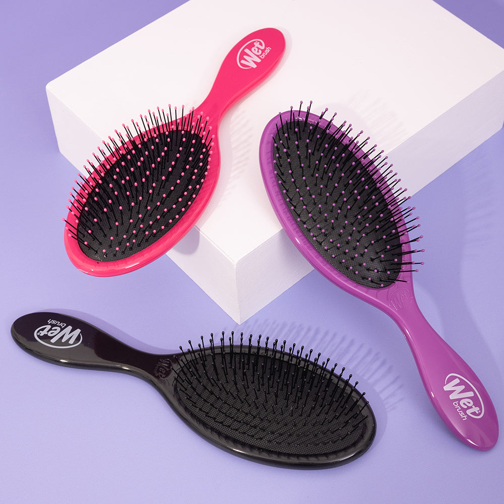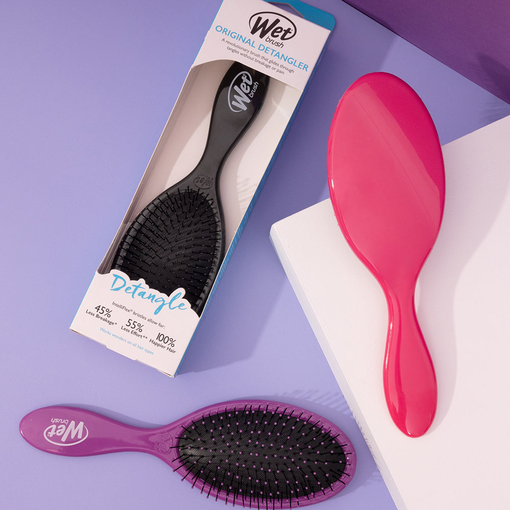 WetBrush Detangling Brush is America's favourite! Available in bright pink, this detangler glides through knots and tangles with effortless ease. The secret is in the exclusive, ultra-soft IntelliFlex bristles, designed to gently diffuse tangles on all hair types, wet or dry. WetBrush Detangling Brush lets you brush with less force, resulting in less damage. Ergonomic grip for comfort.
