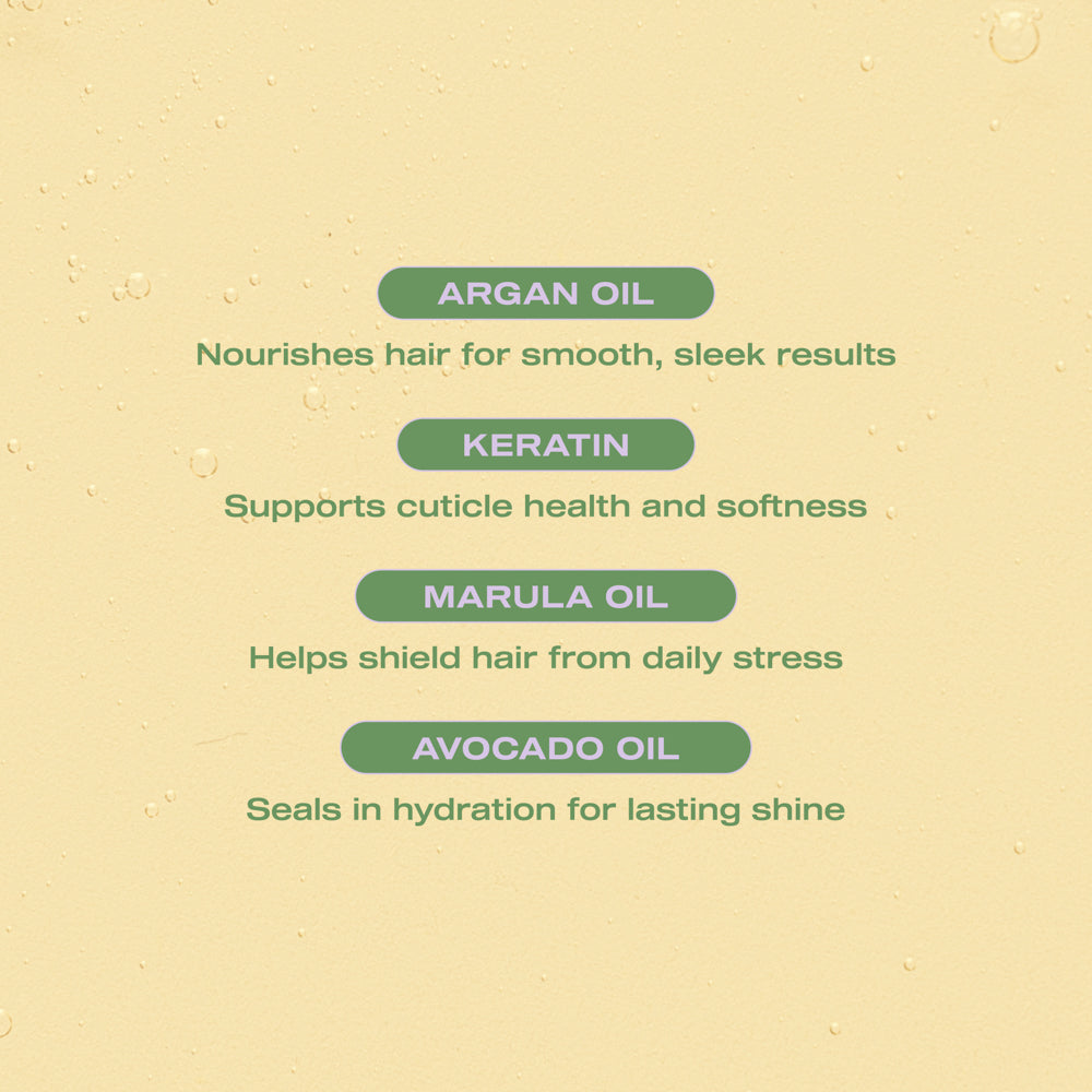 - Argan Oil hydrates, nourishes, and adds shine, taming frizz and leaving hair smooth and glossy.