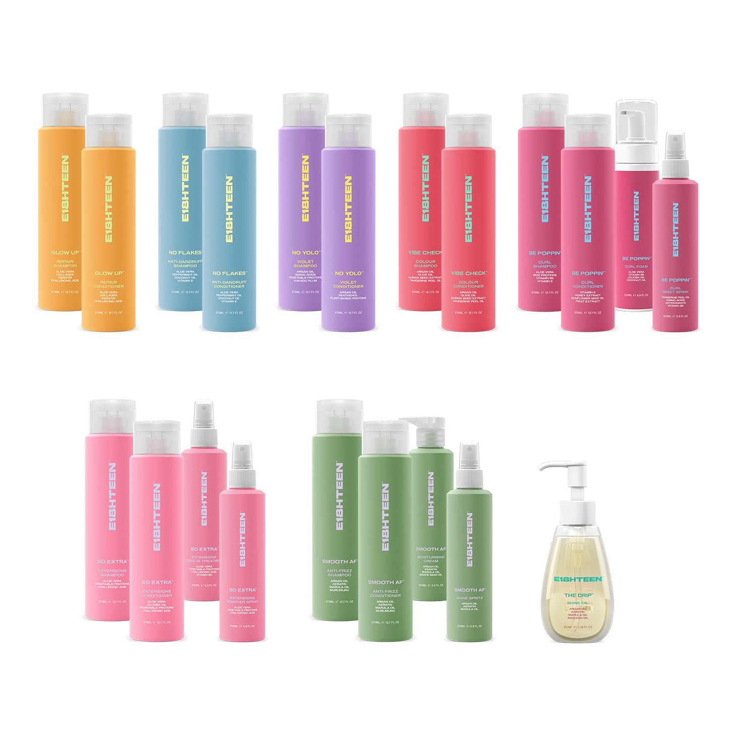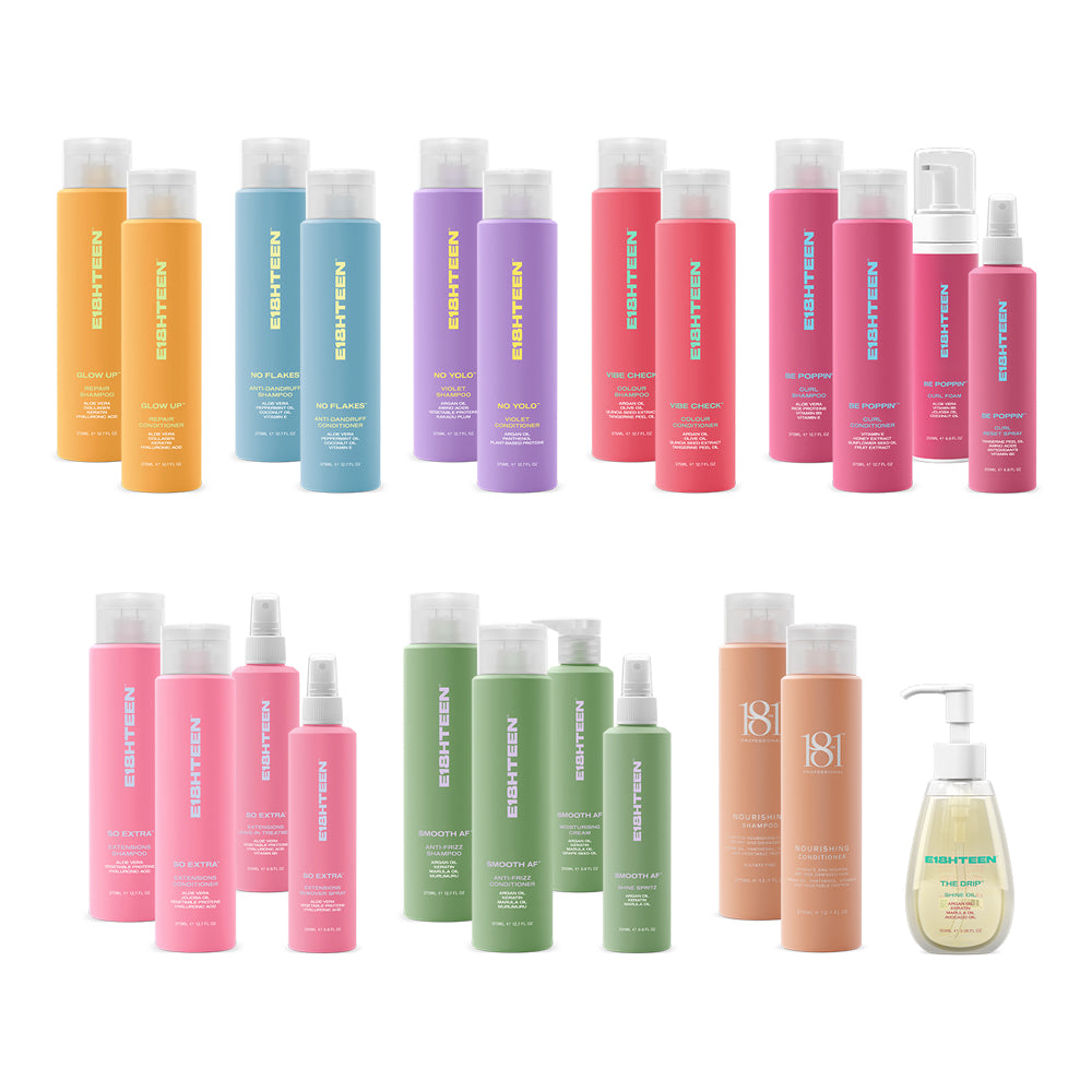 The E18HTEEN Starter Pack Kit is the ultimate introduction to the full E18HTEEN haircare range — a complete, all-in-one bundle that covers everything from repairing damage and taming frizz to enhancing curls, protecting colour, and caring for extensions. Designed as the perfect starter pack, this kit is ideal for salons, stylists, educators, or anyone looking to explore the full product offering in one convenient set.