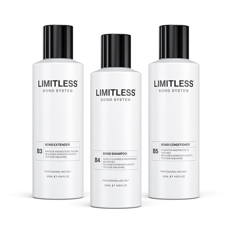 Limitless Home Care Kit contains three home-use products: Limitless B4 Bond Shampoo, Limitless B5 Bond Conditioner and Limitless B3 Bond Extender.