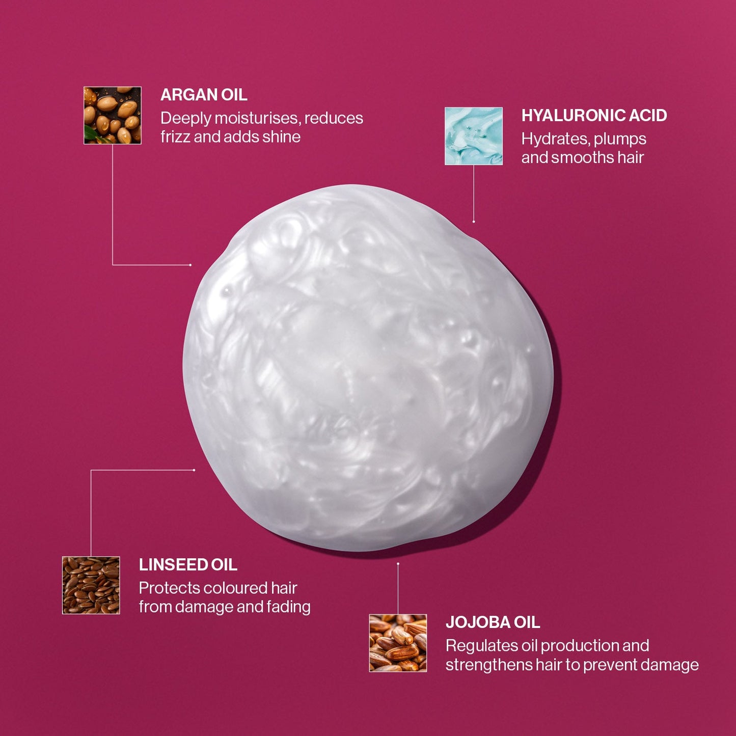 - Filled with hyaluronic acid, argan oil, linseed oil and jojoba oil.
