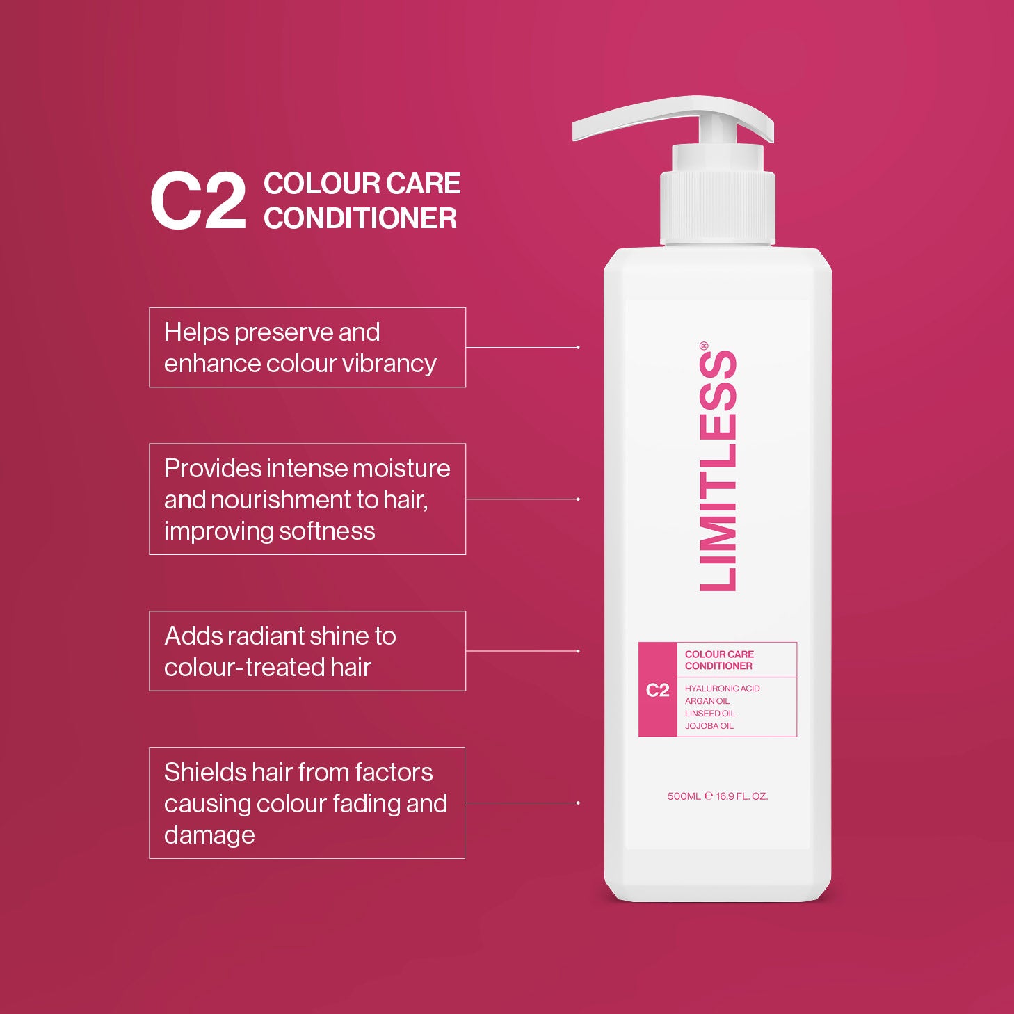 C2 Colour Care Conditioner: Follow up with the C2 Colour Care Conditioner, which deeply hydrates and replenishes your colour-treated hair. Infused with special conditioning agents, it helps to strengthen and protect your hair while enhancing your colour’s vibrancy. The conditioner seals the hair cuticle, locking in moisture and preventing colour from fading due to dryness or environmental stressors. This formula keeps your hair soft, smooth, and full of life without weighing it down.