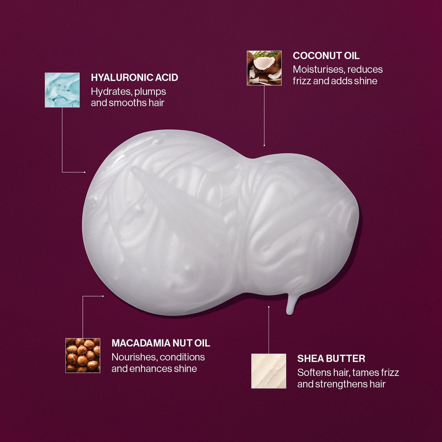 - Contains hyaluronic acid, shea butter, coconut oil, marula oil and macadamia nut oil.