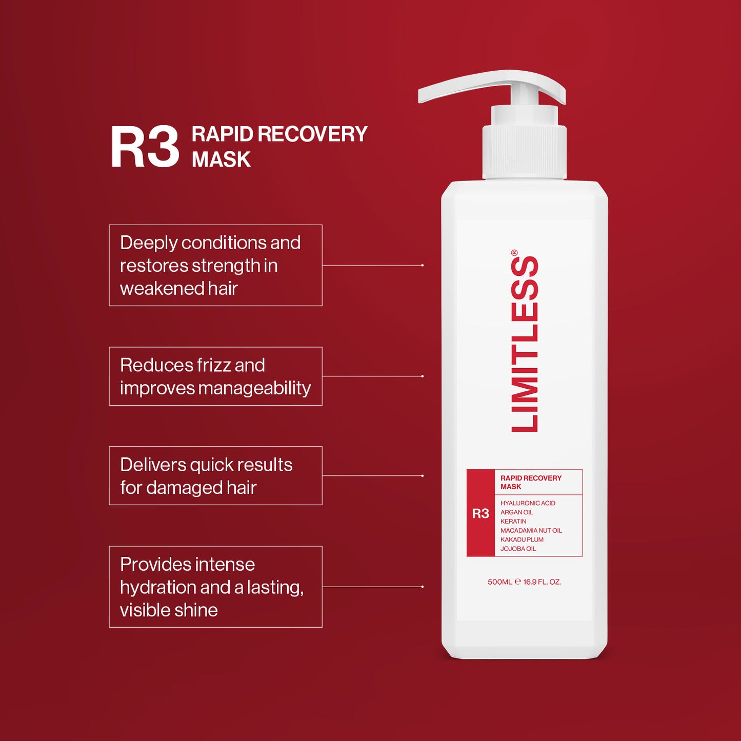 R3 Rapid Recovery Mask: Take your hair care routine to the next level with the R3 Rapid Recovery Mask, a rich, intensive treatment that works to repair and fortify your hair from the inside out. Formulated with nourishing oils and proteins, it targets and restores damaged areas, sealing the hair cuticle and improving texture, so your hair looks and feels smoother, stronger, and revitalised.