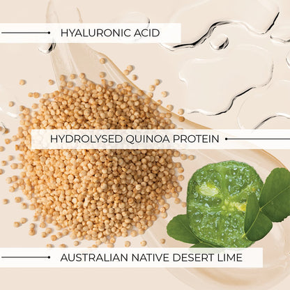 - Filled with hyaluronic acid, quinoa protein and desert lime.