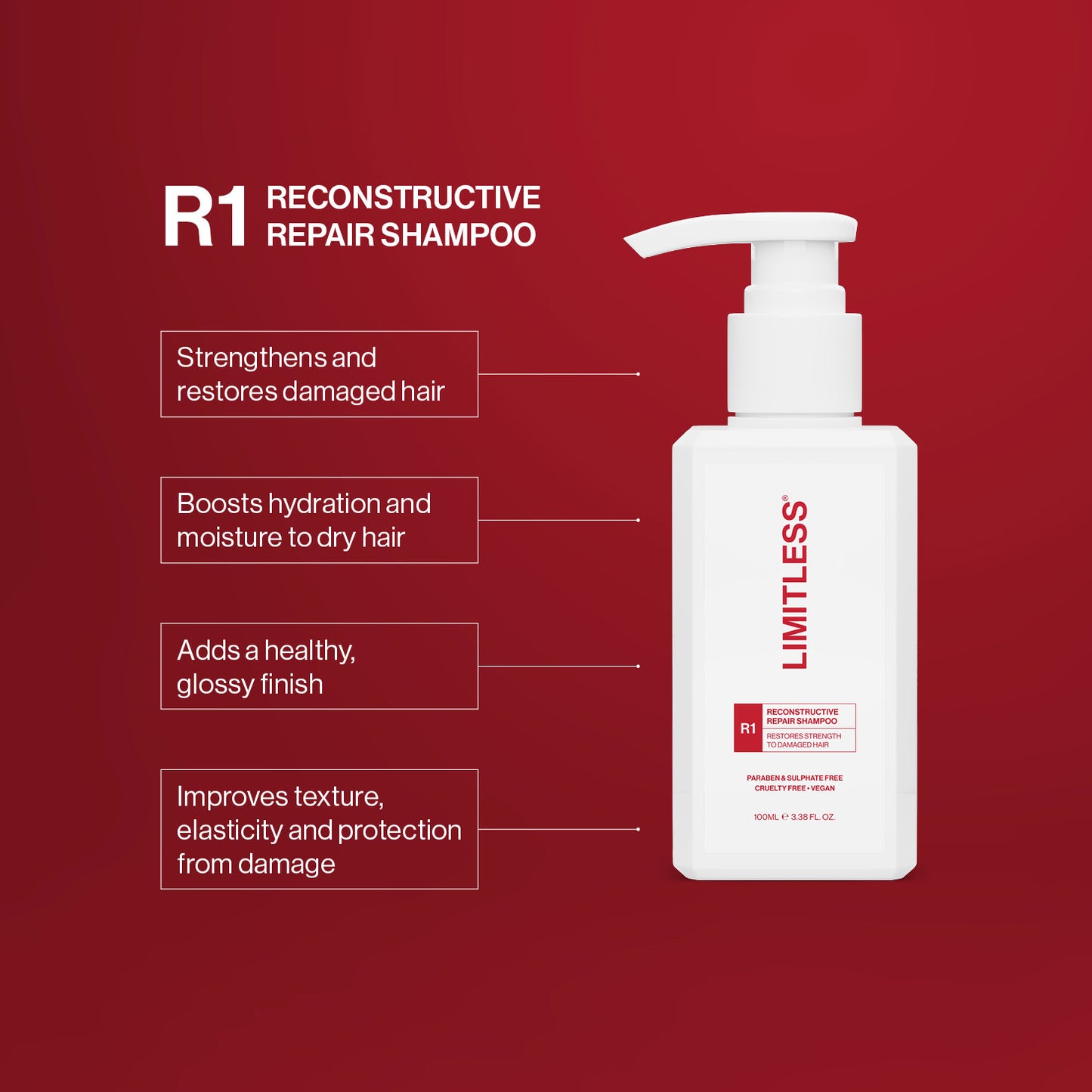 R1 Reconstructive Repair Shampoo: Gently cleanse and restore damaged hair with this nourishing shampoo, designed to repair and strengthen each strand while protecting from everyday wear and tear.