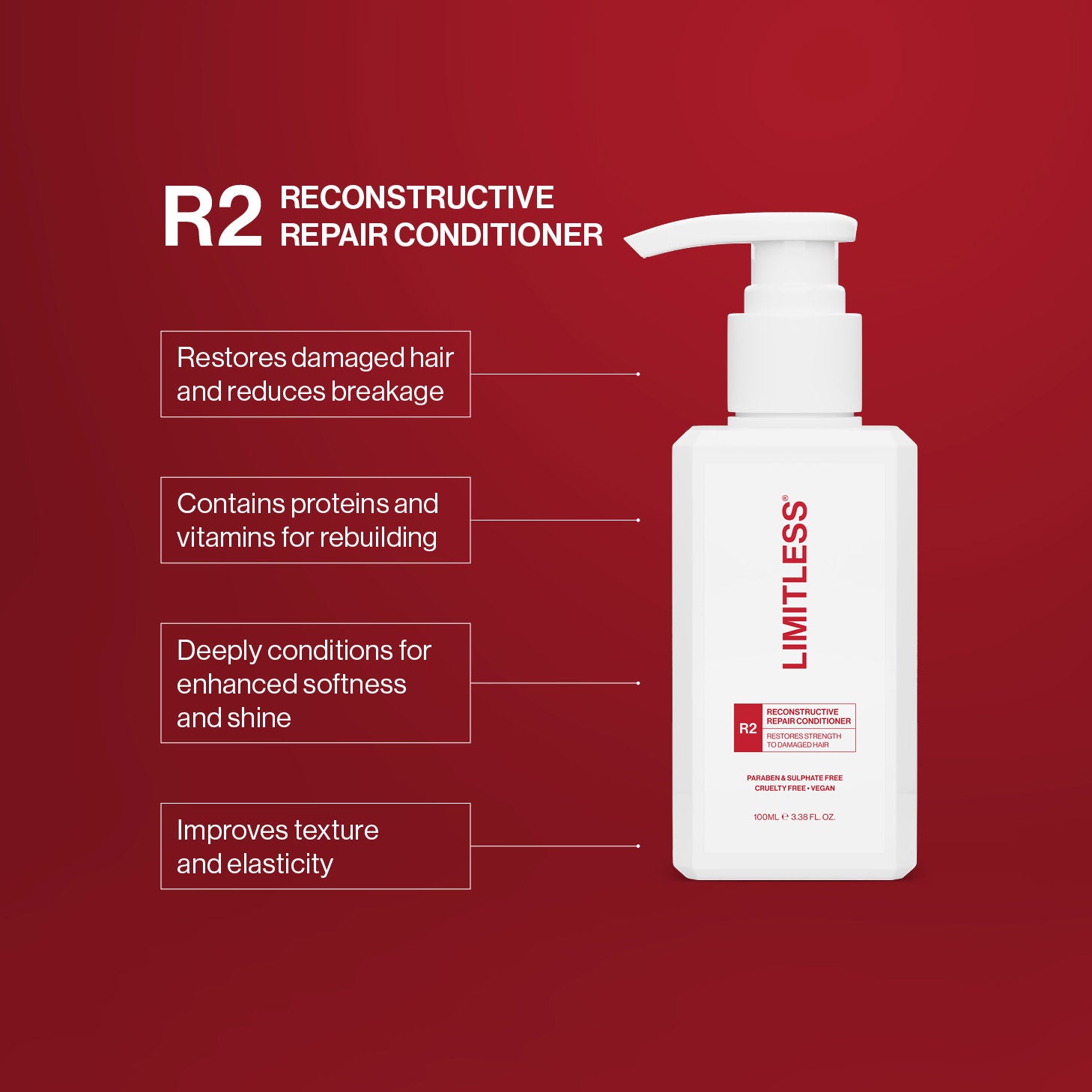 R2 Reconstructive Repair Conditioner: Deeply condition and restore moisture balance, leaving your hair softer, smoother, and revitalised. This conditioner helps rebuild and protect hair from damage caused by styling and the environment.